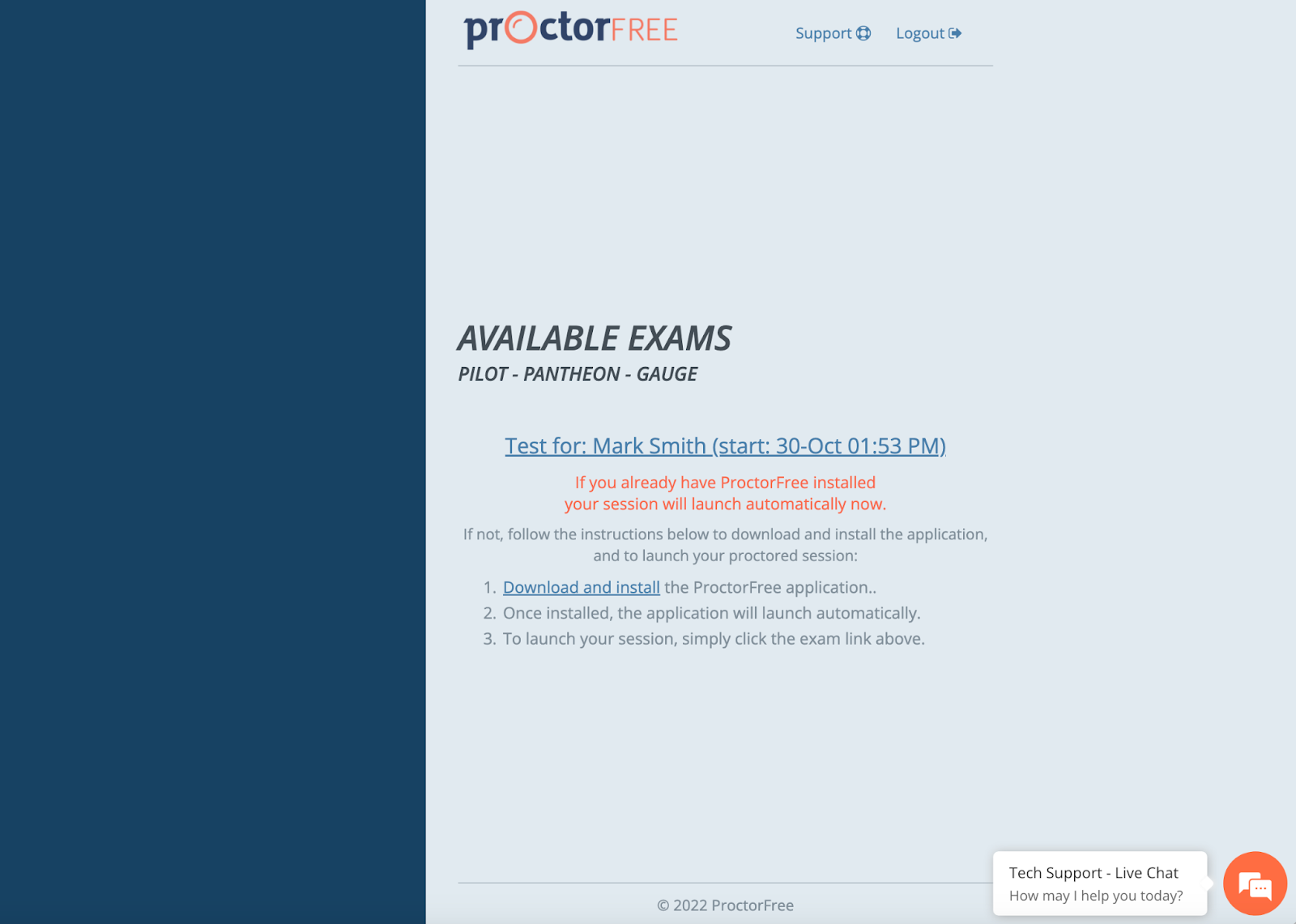 The following directions and instructions were captured by a user on a MacOS device. However, most of the steps here should also be applicable for Windows users. If you run into any technical difficulties or have any questions, you can launch a support session with ProctorFree by clicking the Support Chat icon in the lower right-hand portion of the screen.