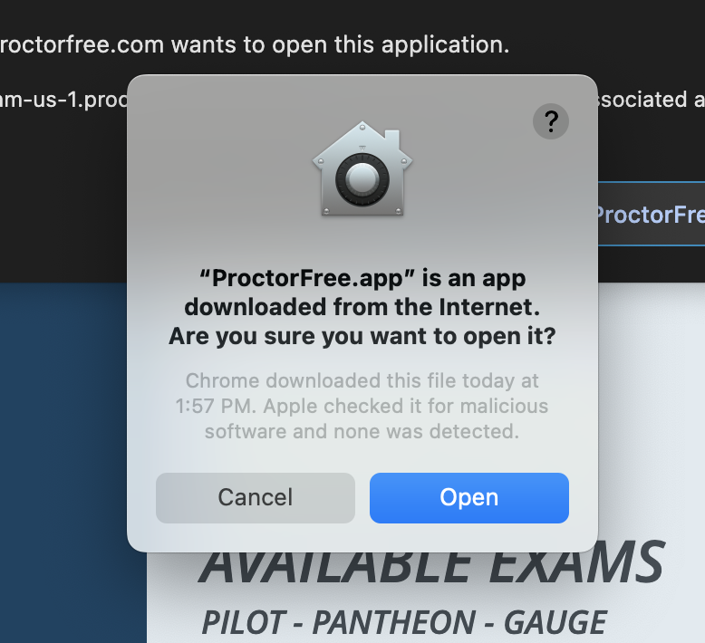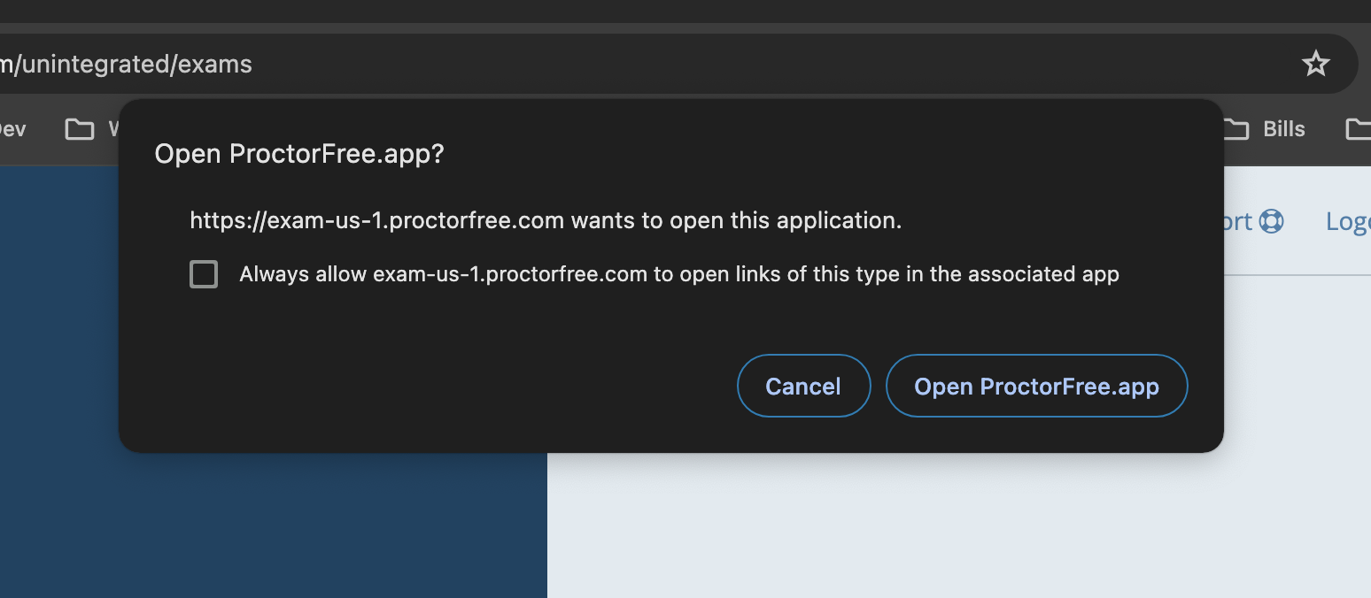 | You will then be prompted to open the ProctorFree app. Click “Open ProctorFree App” and continue. | |