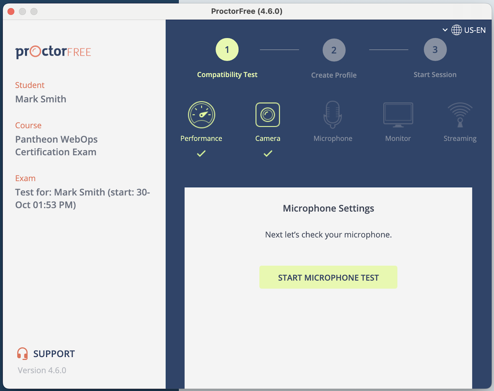 If you are using a Linux machine, you will need to indicate this on the form when you sign up for the exam. In this case, or in any case where the local machine is incompatible with ProctorFree, we are able to accommodate the exam attempt in alternative ways. Typically, we will schedule a Zoom meeting for your exam session, with a live proctor from Pantheon validating the exam attempt by having you turn your web camera on and share your screen while you take the exam.