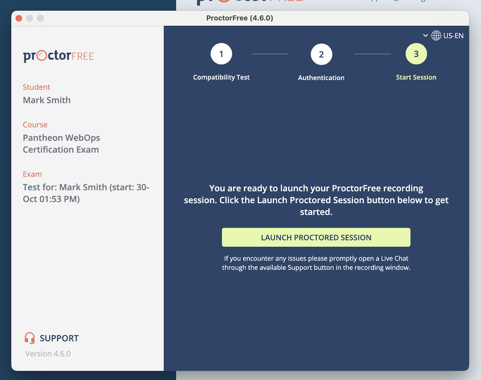 | Now that you have completed the validation and registration process, you are ready to launch your exam. Click the button labeled “Launch Proctored Session” |