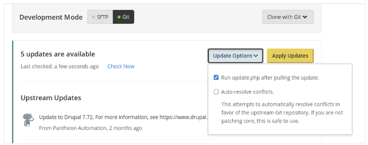 Select whether or not you want to automatically resolve conflicts in the Update Options menu. Drupal users can opt to run