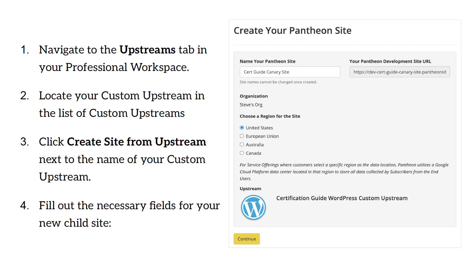 - Describe the steps for creating a new site on Pantheon using a Custom Upstream.