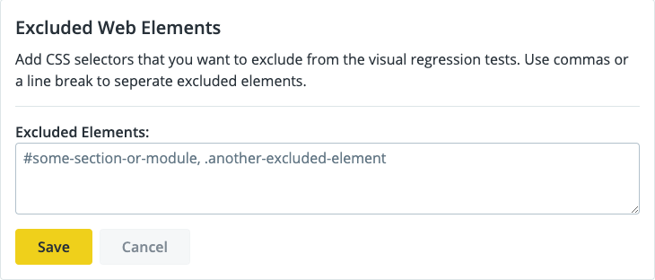 List the CSS selectors you want to exclude from VRT, using a comma or line break to separate elements in the list.