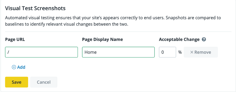 You can add pages to track for visual regression testing, along with a percent of acceptable change.
