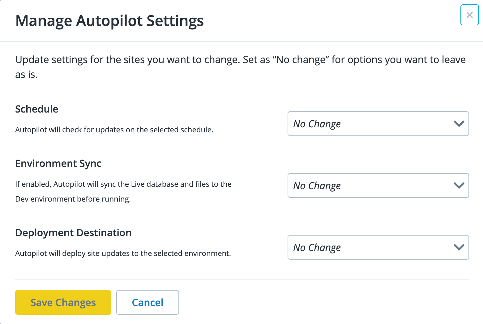 To activate Autopilot for sites in bulk, select the checkboxes for the sites you want to activate, and then click the Activate Autopilot button. You can update settings for the Schedule you'd like Autopilot to run and the Deployment Destination. You can select up to 100 sites. Please note that you cannot access the Autopilot Setup Wizard when enabling in bulk.
