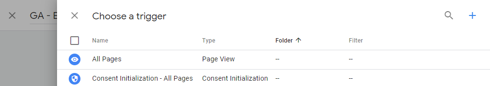 Scroll beyond the Tag Configuration section. In the Triggering section, click the gray circle to choose a trigger that will make the tag fire.