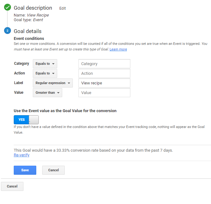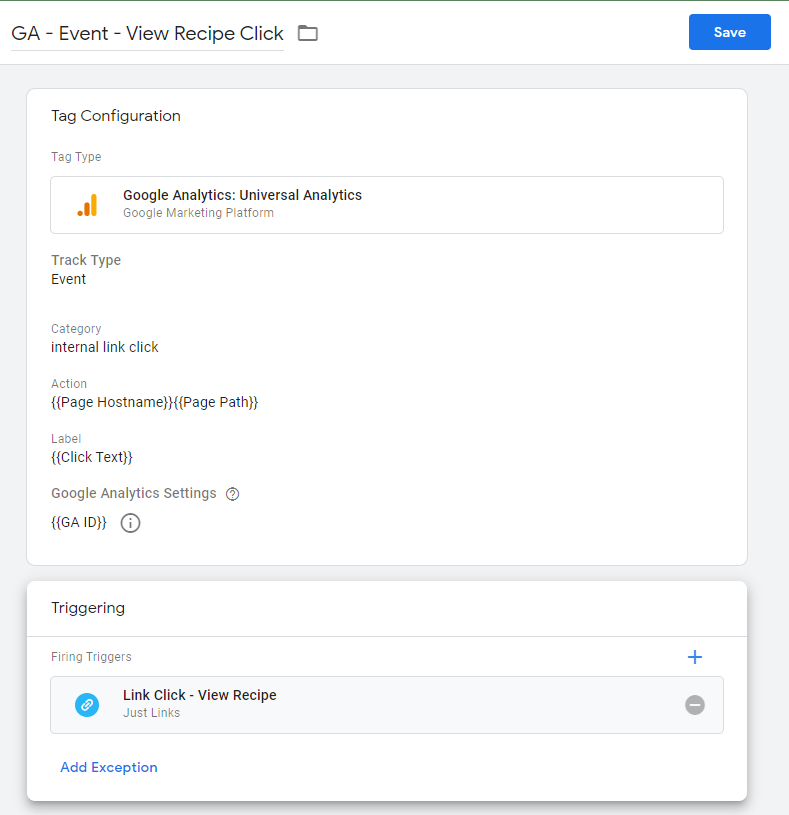 This section will cover how to capture clicks on a particular link and set up a goal with Google Analytics. For this example, we will use Google Tag Manager to capture a “View recipe” button click as an event, and set it up as a goal in Google Analytics.