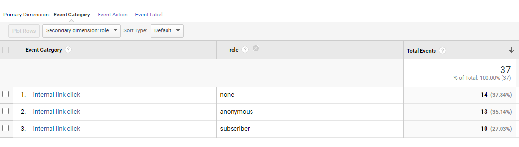 Click on the Secondary dimension button, right below the Event Category label. This will display the custom dimensions you created earlier.