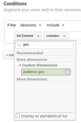 - Under Advanced choose Conditions and select the kind of segment you want to create. For example, if you want to see how Canadian session behavior differs from all other visitors, go to the dimension field, find the appropriate dimension and click on it. In this case, it is audience geo.