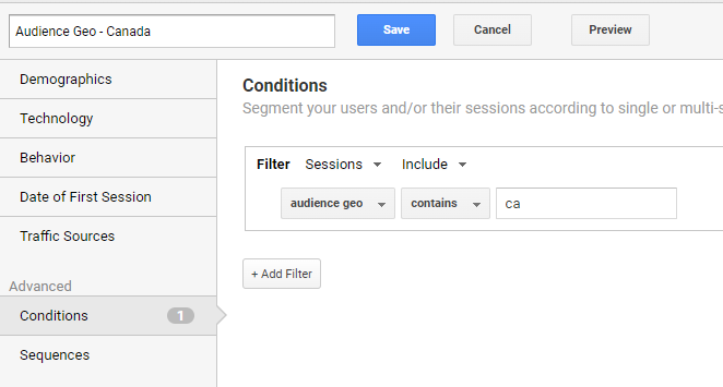 ca. Name and save your segment, for example:Audience Geo - Canada.