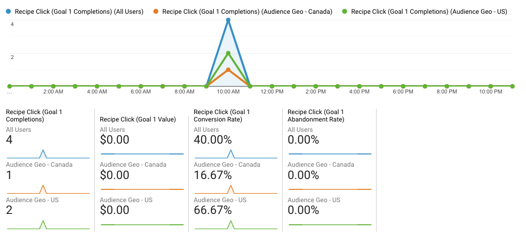 It is useful to add audiences to your Goals. Tying this back to our previous Recipe Click goal, if we add US and Canadian audiences, we can compare outcomes. If we're more interested to see click-through rates based on audience interest, we can do that, too!