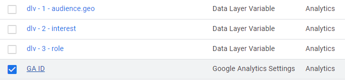 In your list of Custom Variables, be sure that the Type is the same. If you are using a “Constant” or have hardcoded the UA ID into each tag, change that in favor of GTM tags in order to ensure future usability.