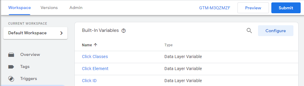 - In Google Tag Manager, click Preview in your Workspace to debug. If you are new to using Preview, please refer to the Preview and debug containers support documentation on Google Tag Manager Support.