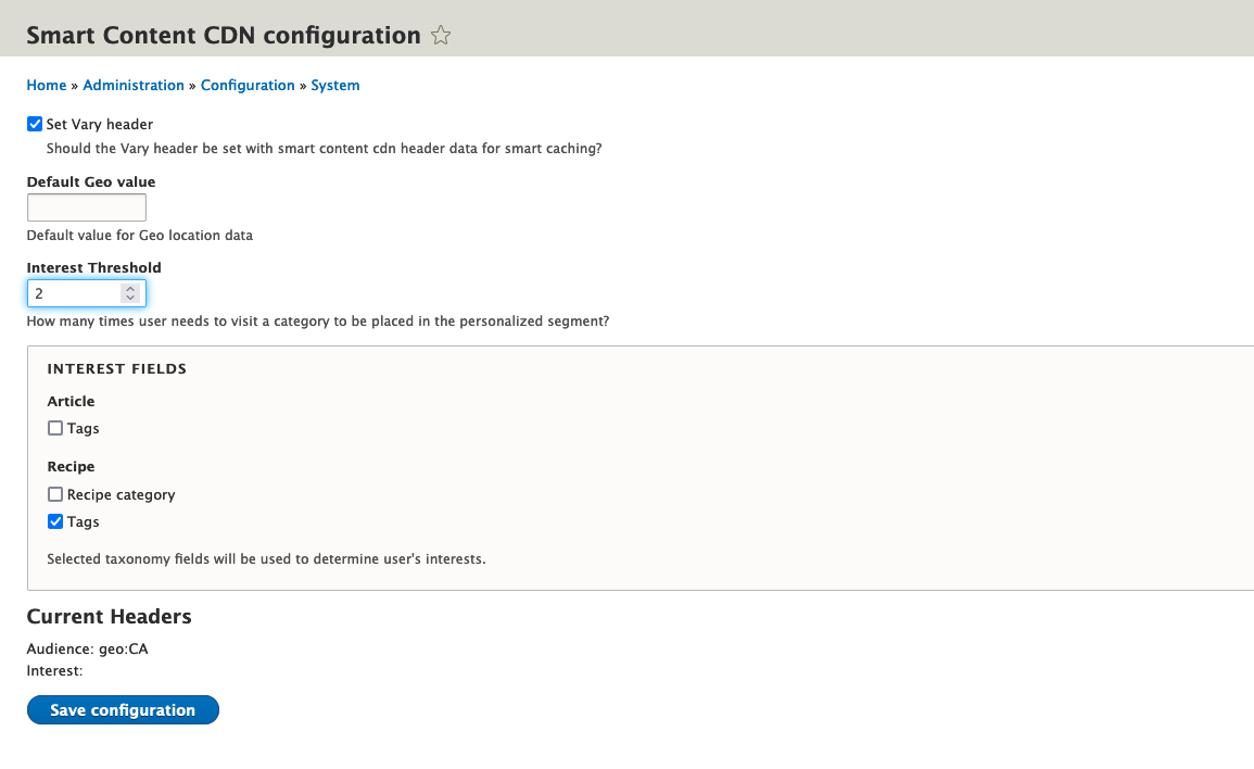 The Smart Content CDN module extends Smart Content's functionality, and leverages the Pantheon Edge Integrations, a CMS-agnostic PHP library. The setup steps above provide two use cases: Geolocation and Interest, but there is much more you can accomplish with Smart Content and content personalization. For more information about the module, and other possible use cases, refer to the Smart Content CDN module.