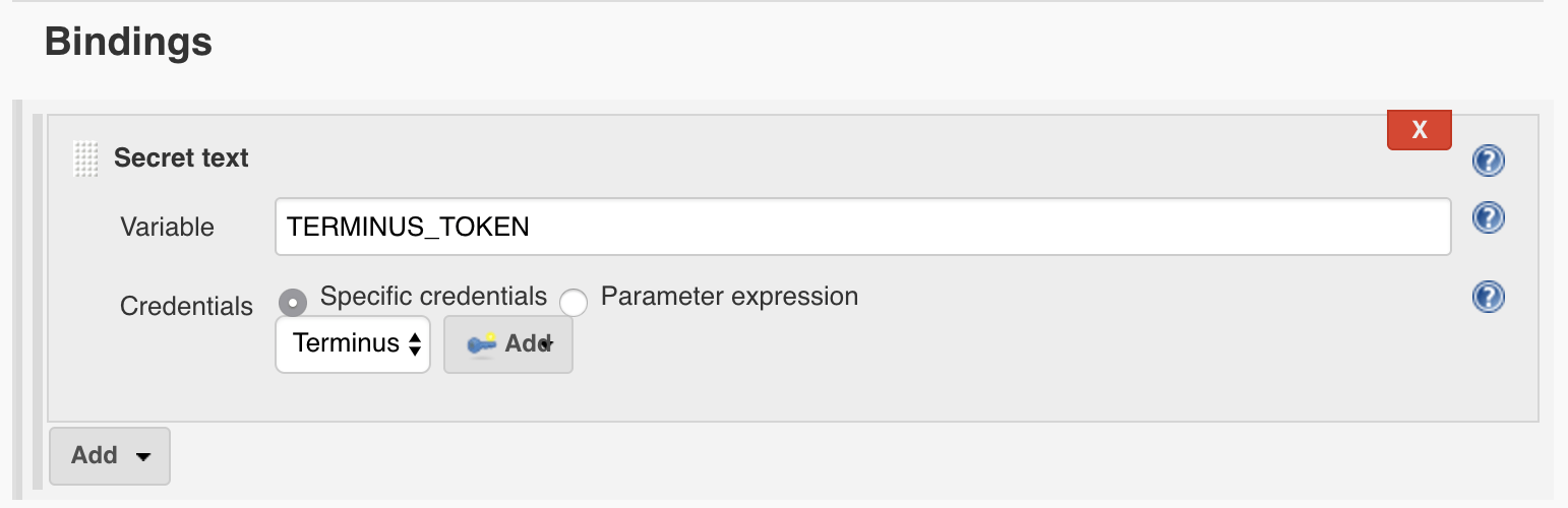 Check the Use secret text(s) or file(s) option, click Bindings, add a secret text binding named TERMINUS_TOKEN, and select the Terminus secret text credential from the drop-down menu: