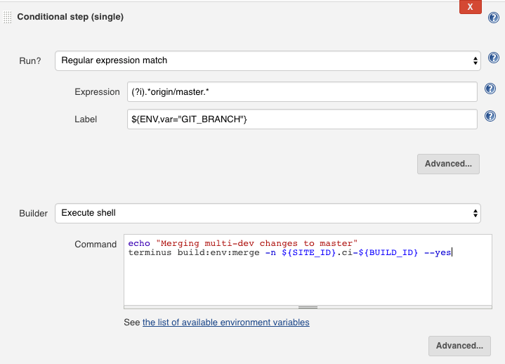 Add one Conditional step (single) build task to merge the code from the Pantheon Multidev to the pantheon/master, i.e. your Dev site on Pantheon. This will only happen when changing the master branch.