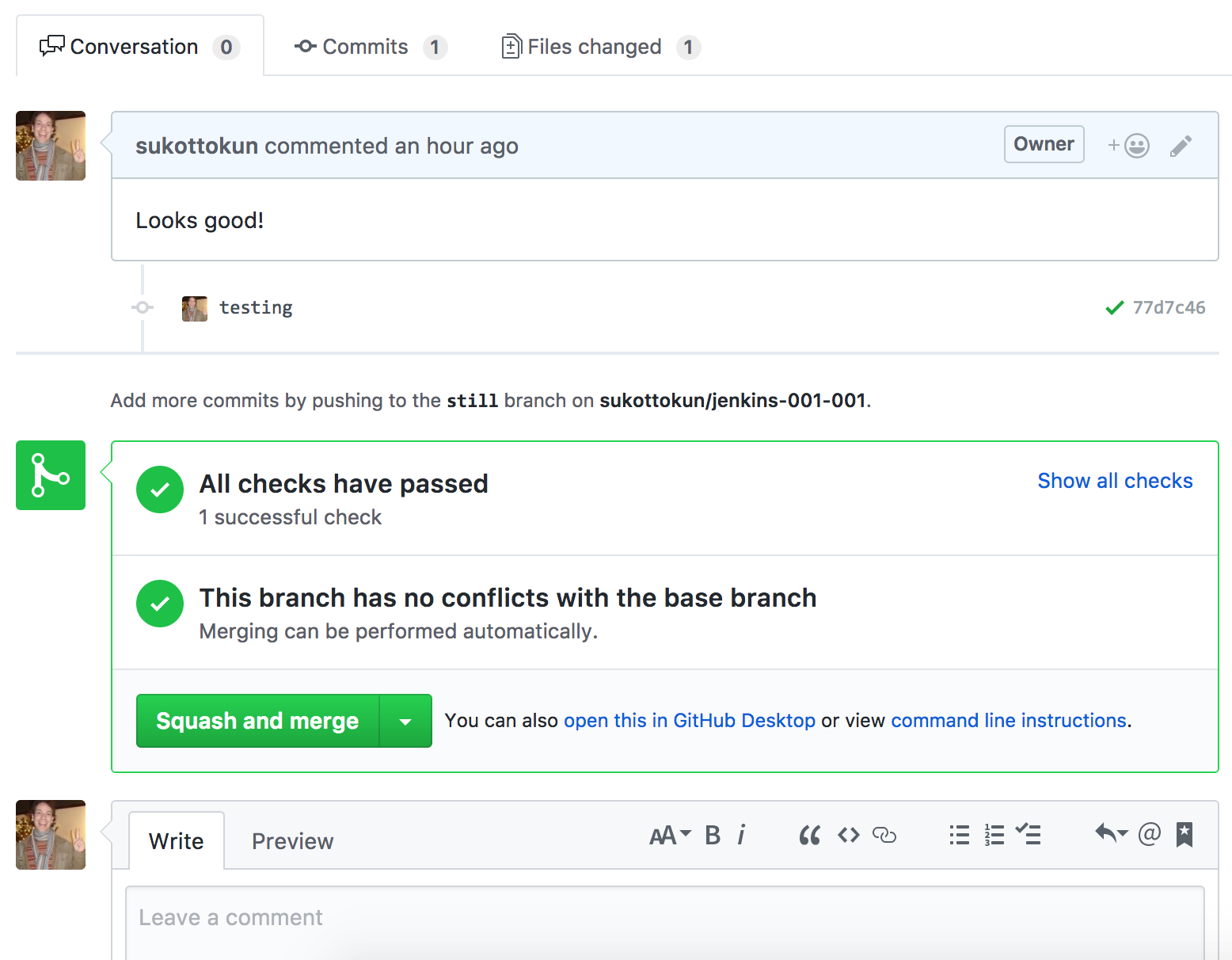 You should now be able to create a local branch, commit a change, and push to GitHub. You should also be able to open a pull request on GitHub successfully.