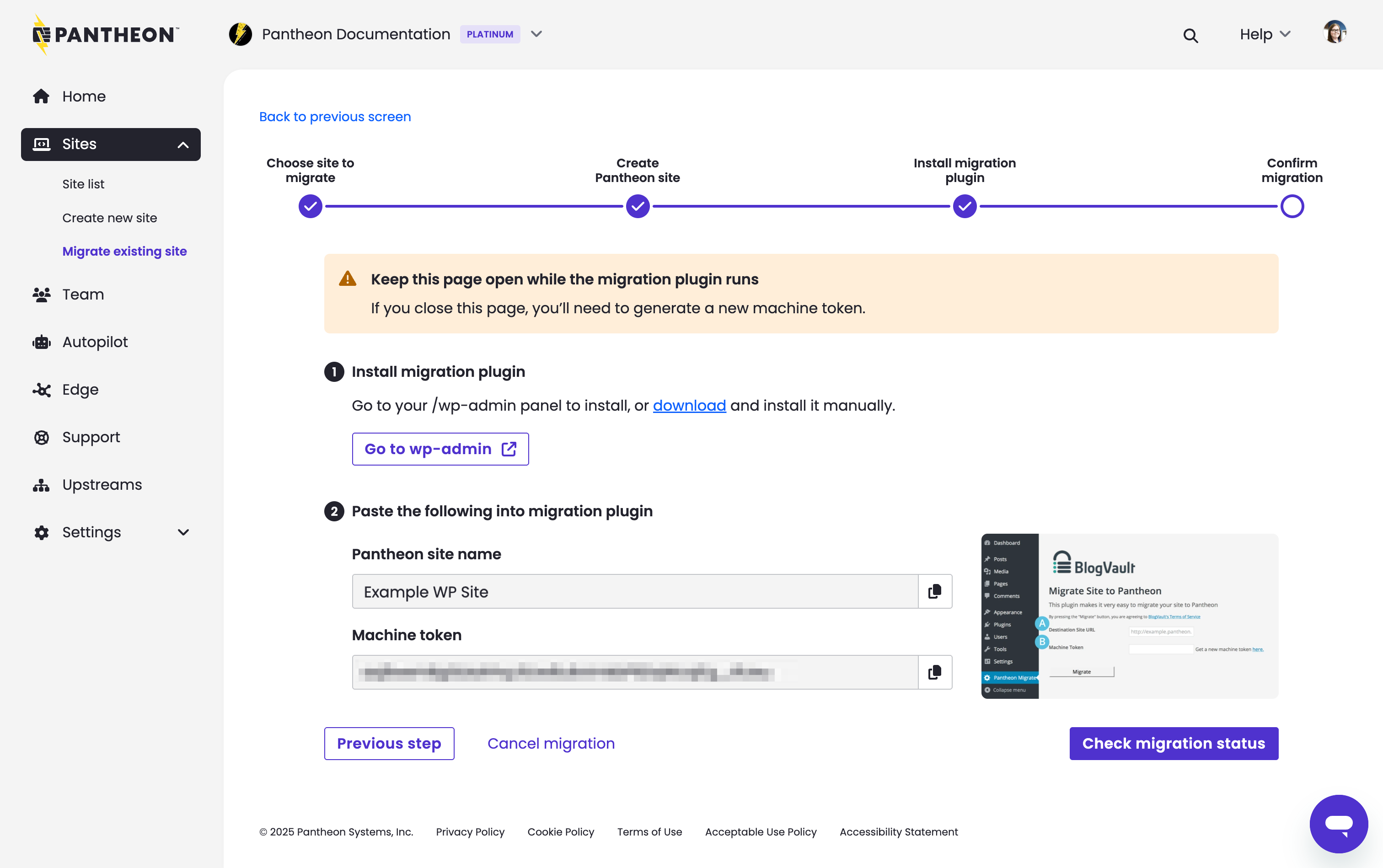 Go back to the Pantheon tab and click Confirm migration progress. Your site's dashboard appears.