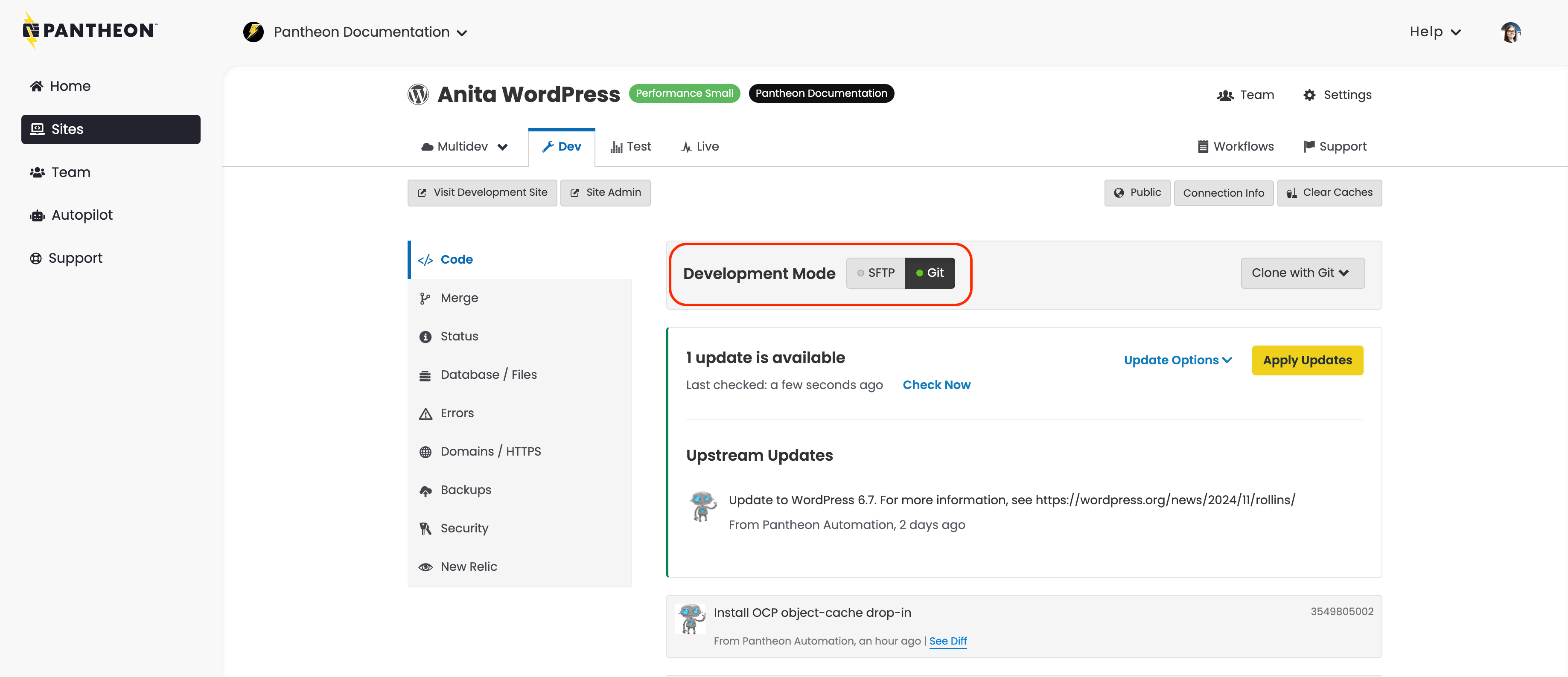 - Go to the Code tab of your Dev environment on the Site Dashboard. You should see your site's pre-existing commit history and the most recent commit adding Pantheon's core files.
