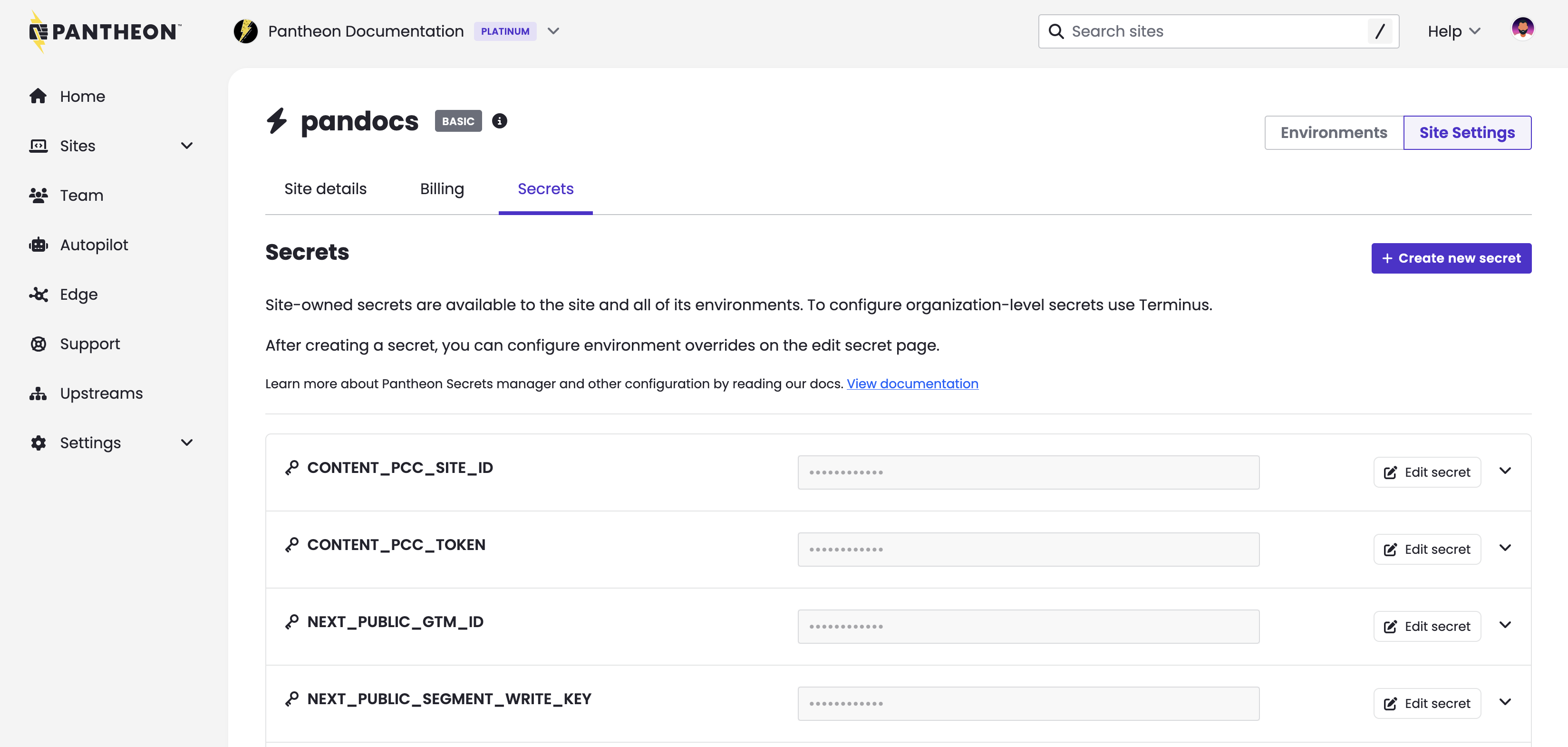 Teams using Pantheon's Secrets Manager to set variables like API tokens can now do so through the site dashboard. Previously this feature only had a command line user interface through a Terminus plugin. Secrets Manager works with WordPress, Drupal, and Next.js sites hosted on Pantheon. It does not work with the sunsetting Front-End Sites product.